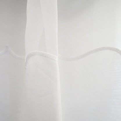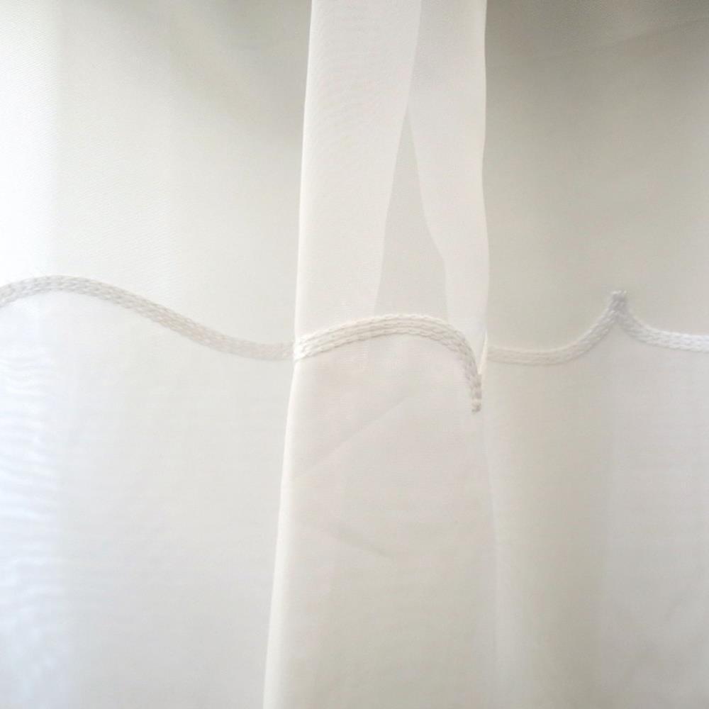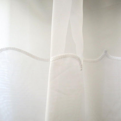 Crystal II is a plain 100% polyester voile with a cornelli bottom (wavy hem on base). It is fire rated, so fine for commercial applications.