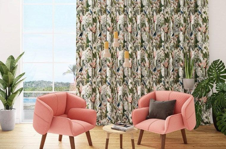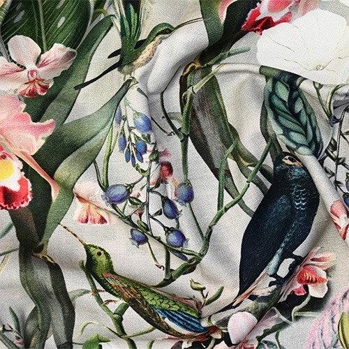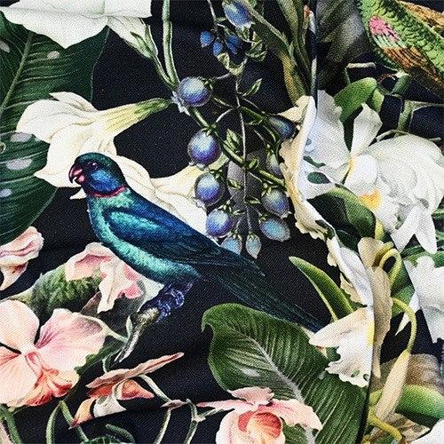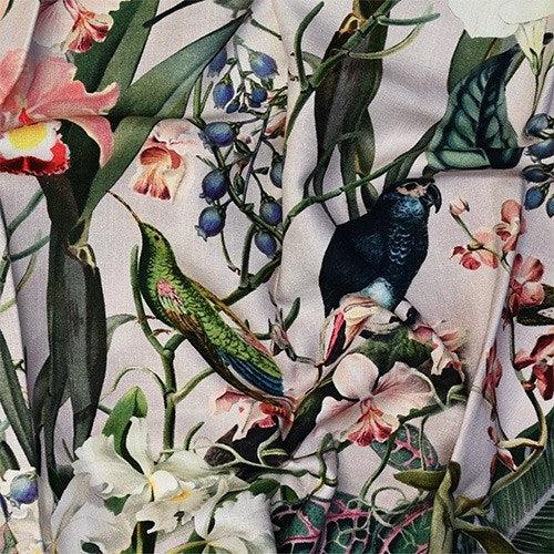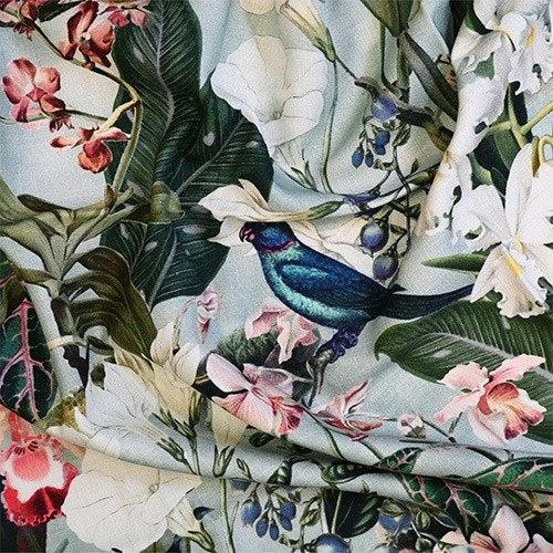Introducing Kalani by Maurice Kain, a versatile and enchanting fabric designed for both drapery and upholstery applications. Immerse yourself in the tropical allure of Kalani, featuring a distinctive print and a vibrant colour palette inspired by the lush beauty of tropical landscapes, complemented by charming bird motifs and floral prints.